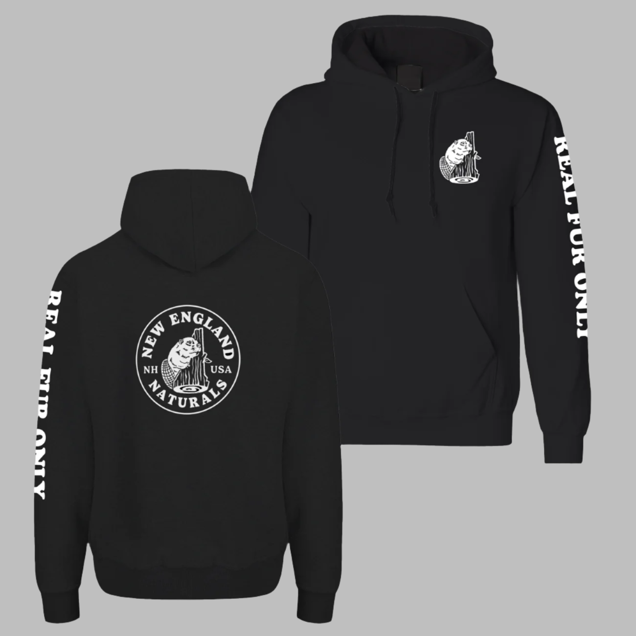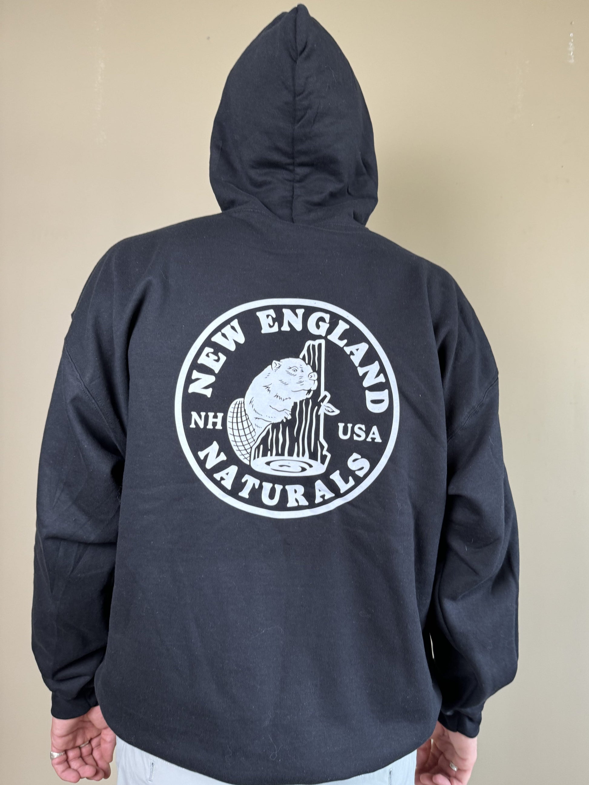 New England Naturals Logo Sweatshirt with the signature logo on the back, our 'real fur only' slogan down the sleeve, and NEN beaver on the front. These Glidan heavy cotton sweatshirts are unisex and range from small to XXL.